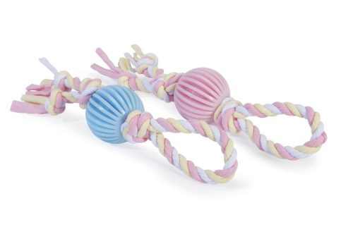 Egy aranyos és színes TPR labda szövetkötéllel, amely ösztönzi kutyája egészséges mozgását.