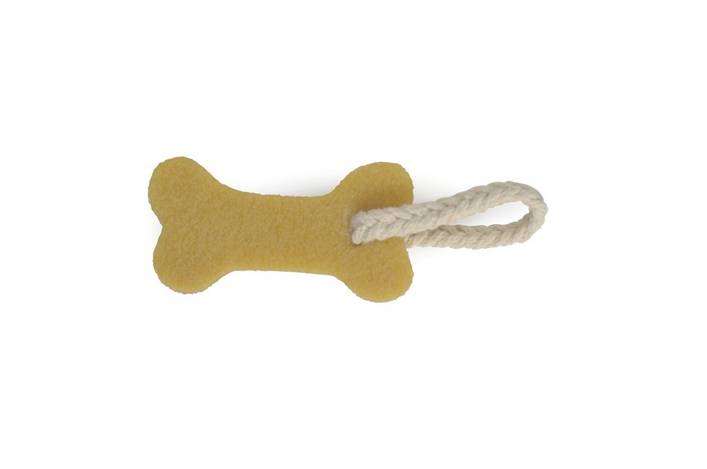 Vidám kutyajáték, természetes gumiból és kötélből, csont alakúra formálva.